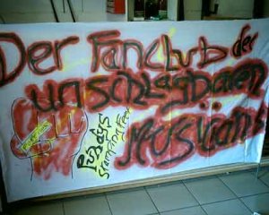 Unser Fanclub ist im Besitz von 2 Flaggen, die unterschiedlicher nicht sein können (s. unten) Die erste (die unten zu sehen ist) hat Fair gelbe Banane, die sich im Raum Sachsen aufhält, und die andere (die unten zu sehen ist) habe ich, also Musical Kralle. Ich halte mich im Raum Berlin und Brandenburg auf.